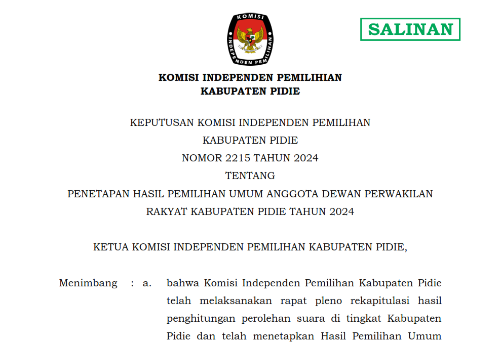 PENGUMUMAN KEPUTUSAN KOMISI INDEPENDEN PEMILIHAN KABUPATEN PIDIE NOMOR 2215 TAHUN 2024 TENTANG PENETAPAN HASIL PEMILIHAN UMUM ANGGOTA DEWAN PERWAKILAN RAKYAT KABUPATEN PIDIE TAHUN 2024