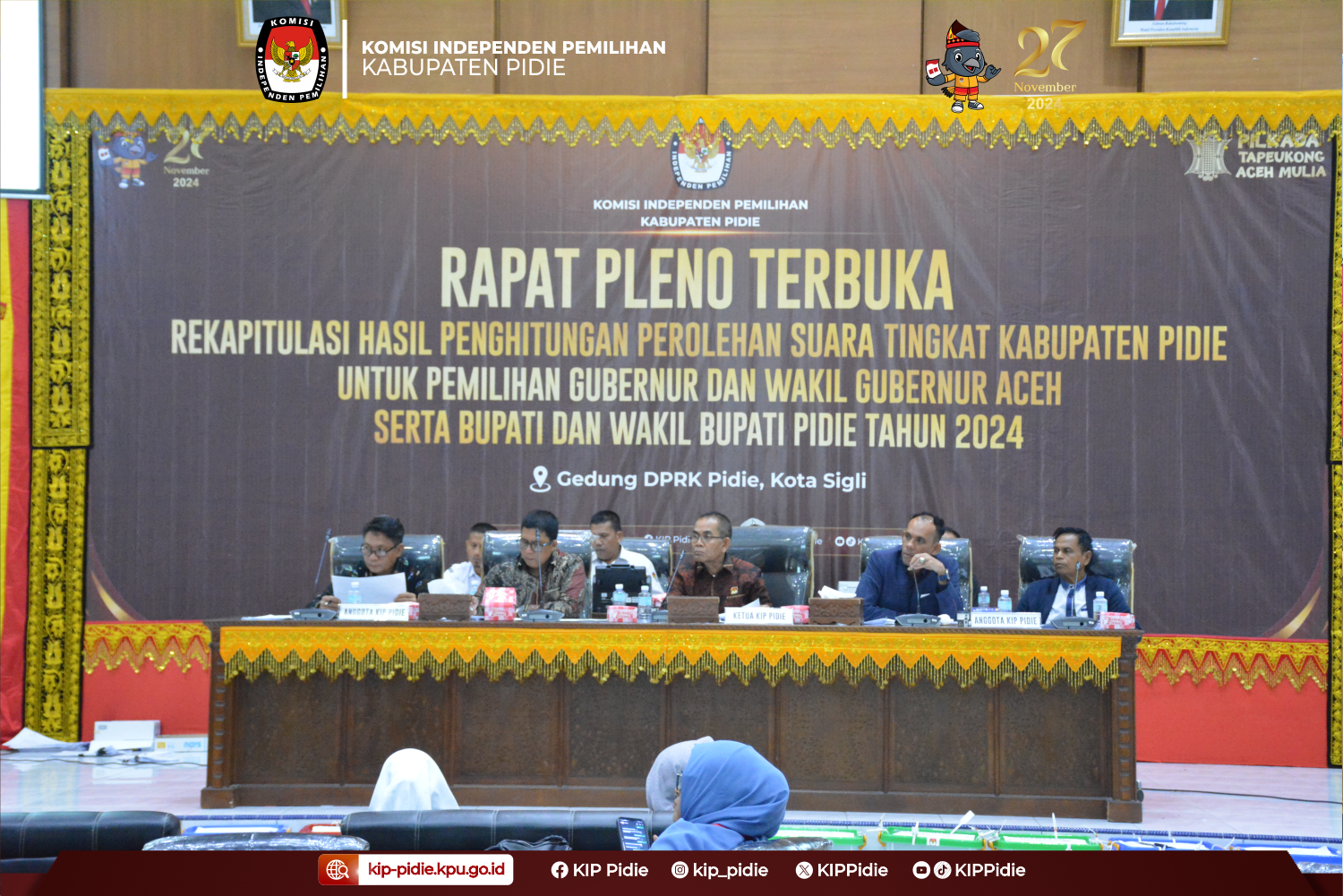 #TemanPemilih Komisi Independen Pemilihan (KIP) Kabupaten Pidie menggelar Rapat Pleno Terbuka Rekapitulasi Hasil Penghitungan Suara Tingkat Kabupaten Pidie untuk Pemilihan Gubernur dan Wakil Gubernur Aceh serta Bupati dan Wakil Bupati Pidie Tahun 2024. Rapat Pleno Terbuka berlangsung mulai 2 s.d. 3 Desember 2024 di Gedung DPRK Pidie, Kota Sigli. Acara dibuka oleh sambutan Pj. Bupati Pidie yang diwakili oleh Jufrizal selaku Pj. Sekda Kab. Pidie dan dibuka oleh Ketua KIP Kabupaten Pidie, Ramli Usman yang didampingi jajaran Forkopimda Pidie serta Anggota KIP Kabupaten Pidie, Sufyan, Azhari, Azharuddin, Edi Kurniawan. Rapat Pleno Terbuka berlangsung lancar dan tertib dimulai dengan Panitia Pemilihan Kecamatan (PPK) membacakan D.Hasil-Kecamatan secara bergiliran sejumlah 23 kecamatan, dilanjutkan dengan pencermatan draf dan penandatanganan hingga penyerahan D.Hasil-Kabupaten Pidie baik Pemilihan Gubernur dan Wakil Gubernur Aceh maupun Bupati dan Wakil Bupati Pidie Tahun 2024. Rapat Pleno Terbuka turut dihadiri PPK 23 Kecamatan se-Kabupaten Pidie, Panwaslih Kabupaten Pidie, Saksi Paslon Gubernur dan Wakil Gubernur Aceh Nomor Urut 01 dan 02, Saksi Bupati dan Wakil Bupati Pidie Nomor Urut 01, 02, 03 dan 04 serta tamu undangan lainnya. Rapat Pleno Terbuka ini juga disiarkan secara langsung melalui kanal Youtube KIP Kabupaten Pidie sehingga seluruh masyarakat Pidie dapat menyaksikannya secara langsung. #KIPPidie #KIPAceh #KPURI #HumasKIPPidie #PilkadaSerentak2024 #KPUMelayani....