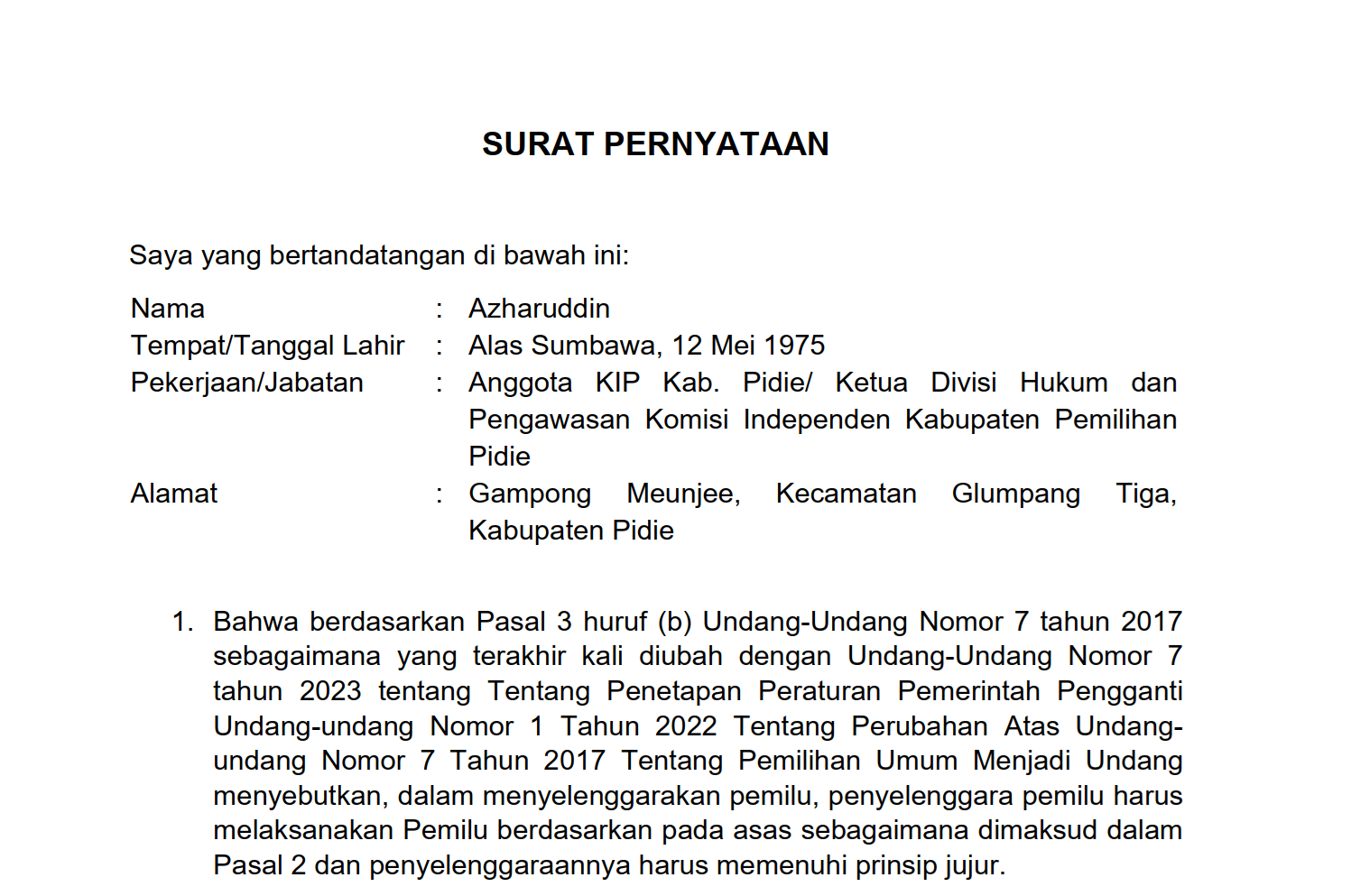 Surat Pernyataan Azharuddin